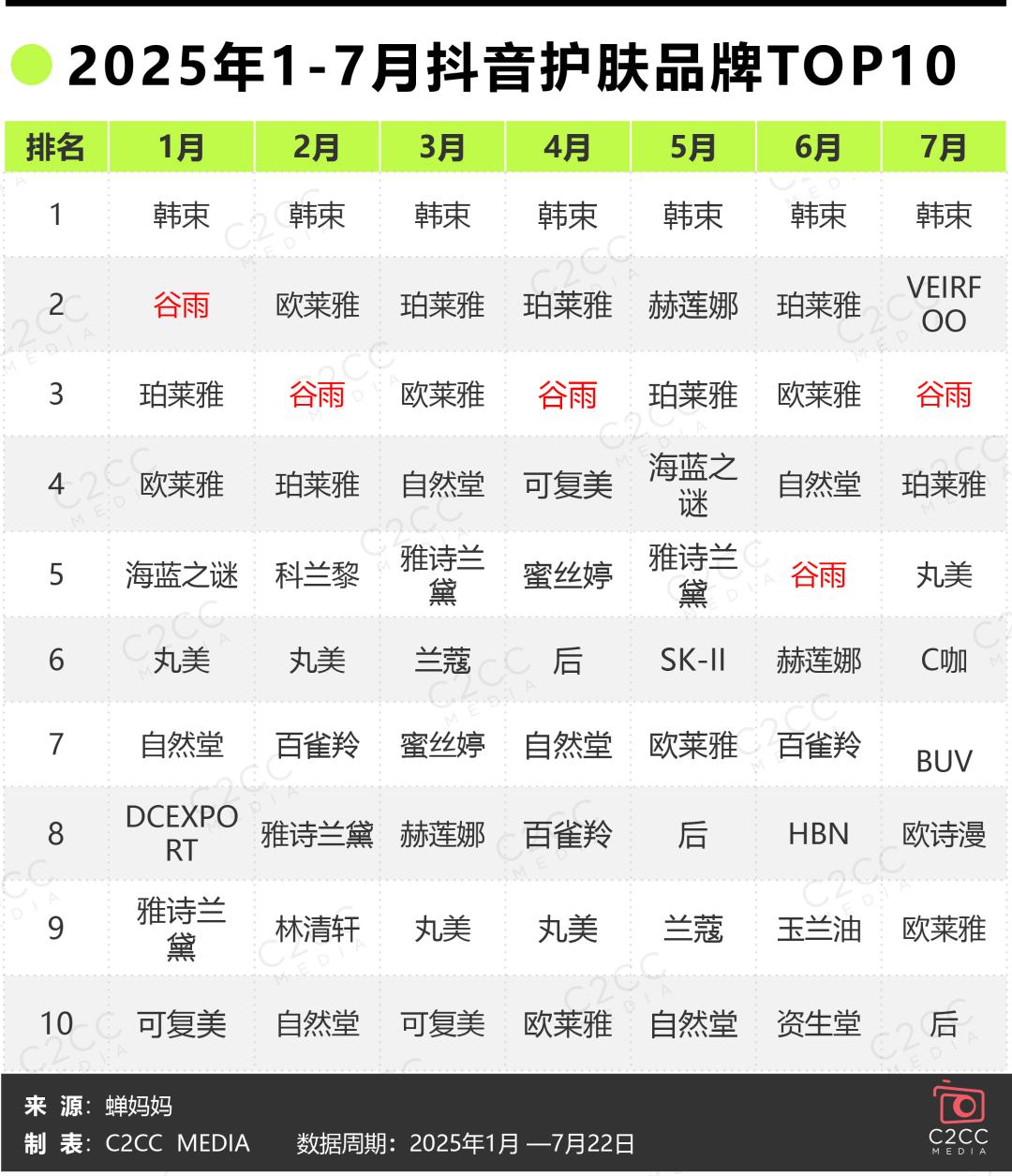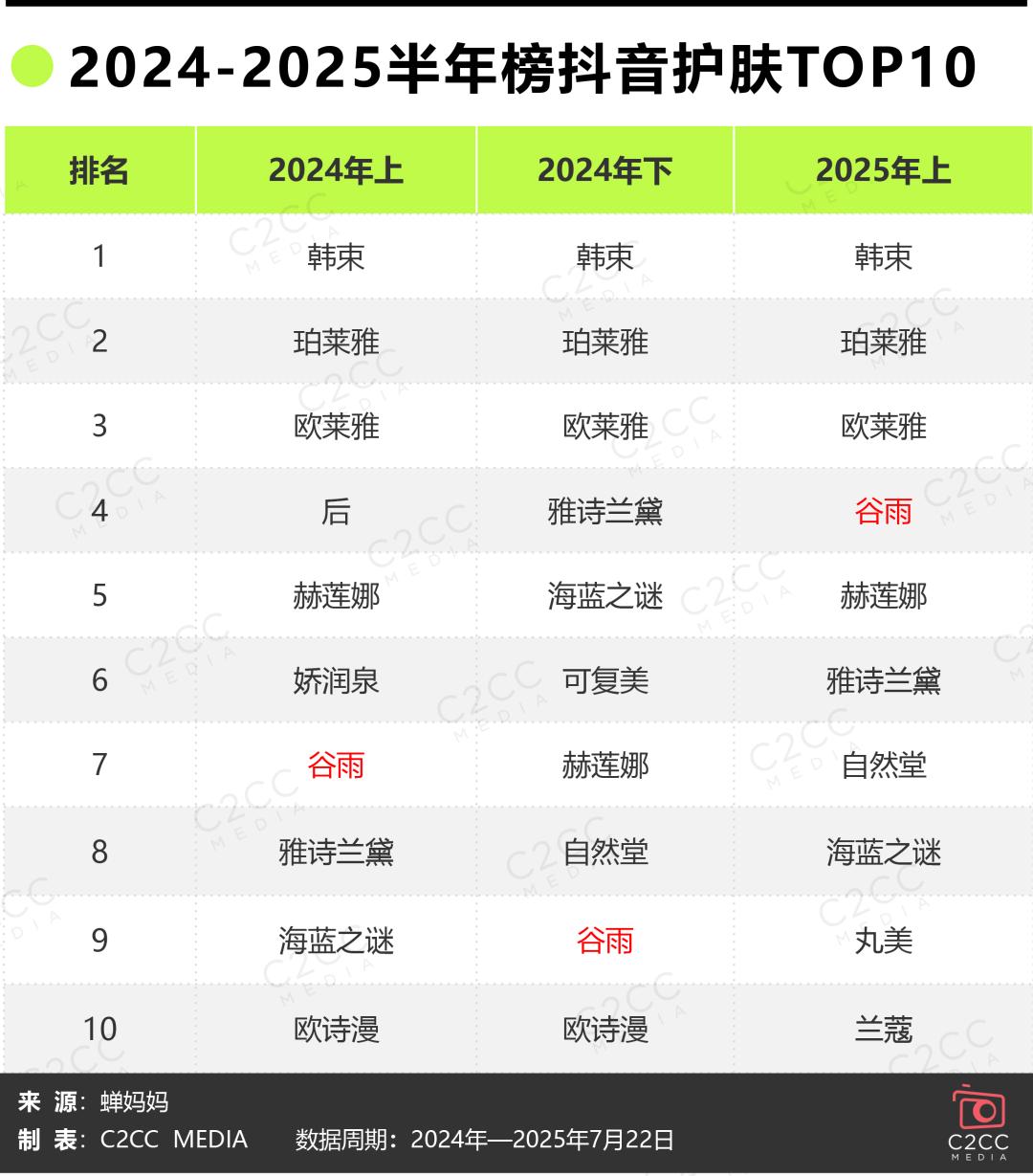 近一年内,谷雨在抖音狂飙。蝉妈妈数据显示,2024年,谷雨位列抖音护肤榜第7;今年上半年,强势挤进TOP5,排名第4,仅次于欧莱雅,领先赫莲娜、雅诗兰黛。今年1-7月,谷雨5次闯入单月抖音护肤TOP5,5次排名第3,1次排名第2。